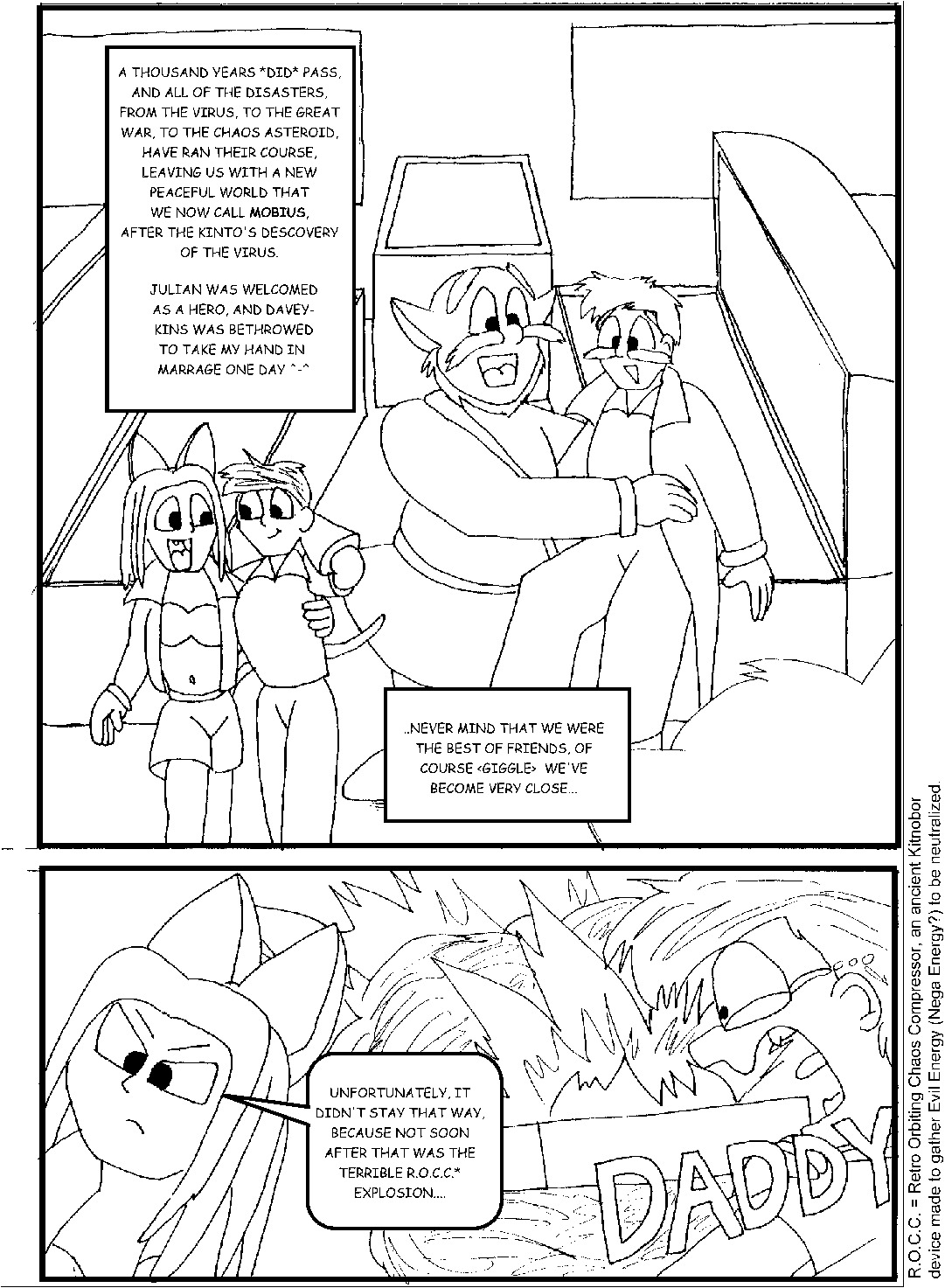 Still self assured from his protest comic, David Gonterman spied an opportunity. Unhappy with the newest issues of the licensed series, he took pen to paper, sketching up the first issue of Sonic: The Mobius Chronicles. Taking cues from how he made Sailor Moon: USA, Gonterman used Blood and Metal as a starting point. Removing many of the fan characters, he wrote up a simplified story of how Julian Kintobor became Dr. Robotnik. Infusing elements from the various Sonic continuities that existed at the time, he was sure he had a hit on his hands. He said as much on alt.fan.sonic-hedgehog.