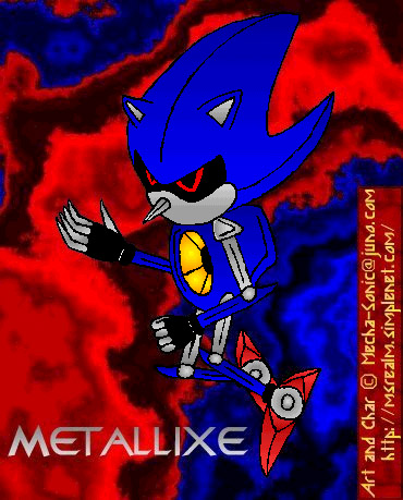 Background: Metallixe or MentalSonic as he was called, was built by Robotnik to do small things here and there around Robotropolis. Like repairing Swatbot's and moving equipment. Around 3 weeks of his creation, he was sent of to find a strange meteor that crashed on the side of a hill. The Meteor was giving off some unknown power levels wich Robotnic found to his likeing, when Metallixe found the Meteor it turned out to be a unknown tipe of Black Emerald,never befor seen. Robotnik gave the order to have it returned to him at once, but when Metallixe grabbed the Emerald it somehow absorbed in to him. Granting him a free will, Unlimited power, life, a soul, and a limited Immortality, thus creating the Ultimate Weapon, Metallixe. When Robotnik found out about the powers Metallixe was given, he thought he was the perfect thing to finely be ride of the Freedom Fighters. But it turned out Metallixe didn't care about anything or anyone, he wouldn't listen to Robotnik or followed any orders, he only did as he pleased. Metallixe turned against Robotnik and often destroys buildings for revenge, or just for the fun of it, this went on for a few years. Metallixe was turned in to The Dark Holder of the Dark Power Emerald of an unknown Island, he was linked to it by his now living soul. Surprisingly Metallixe had no control over what he dose, the Emerald that he absorbed is a Living Emerald and controlled his every move. Controlling the Power of the Emerald is almost impossible, but every now and then he's able to gain control of himself for a little while. Metallixe has tryed to find out about and were the Emerald came from. All he knows is that it's from a unknown Island that holds other Emeralds like it, tho there not "evil" like this Black one is. An Island thats not part of Mobius, but is thought to be seen by people flying over a area of the Great Mobian Ocean, some saying it vanished as thay passed over it or came in for a closer look. On time The Emerald took Metallixe to the Island, but by use of whats known as a Warp Ring. But once there he was attacked by a grop called The Holders Of EI, holders to Emeralds similer to the one Metallixe has, yet not evil. He faild that fight, but he hurt almost everyone till he was over powered and had to re-treat back in to the Warp Rings, and back to Mobius.. Metallixe still loves tormenting Robotnik more.. But on one trip to Robotropolis Metallixe was going through some filing cabinets, destroying plans, blue prints, and anything Robotnik needs. But one thing caught his eye, a document about a four-year-old Hedgehog named Rik Marvin Hedgehog, he read that the kid was killed when tried to be robotized. And to Metallixe this was horrifying. Robotnik not wanting to lose the kid, had added on to the lifeless Robotic kid Making Primetory Unit #1: Metallixe. He often had flash backs of a unknown past but didn't understand them, but now he did. He has 2 minds. One of the kid Rik and the Robotic one he has now. Now he's a Wanderer, on a mission to find the Mother he never knew. Wondering the world for the truth of his past, and to find away to get rid of the Emerald that's slowly enslaving his mind. But if the emerald were ever lost, he'd die a slow and painful death.