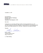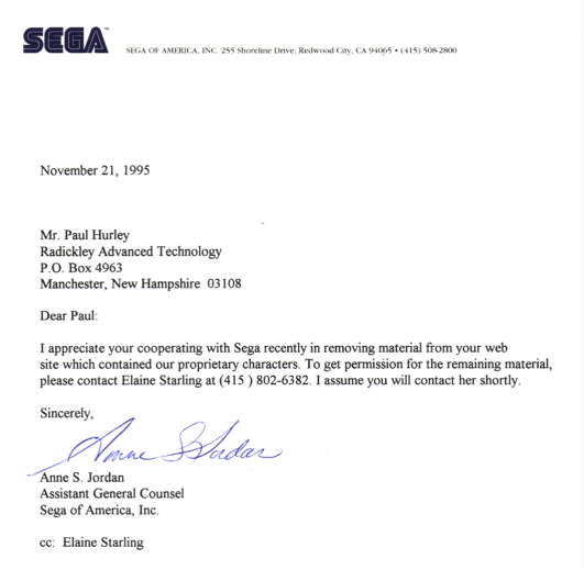 This is to confirm that you will remove all of the offending Sonic (and related characters) material from your web site by Saturday, November 4. You are also using other Sega copyrighted material and trademarks without permission and must either immediately obtain permission or remove this material as well. You can contact Sega's marketing department to see if they are willing to grant permission for this type of use.